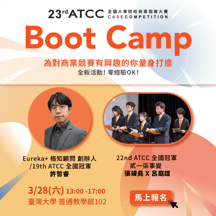 23rd ATCC 將於 3/28 ATCC Bootcamp、4/11 開幕論壇與五堂實戰工作坊、4/18 五堂議題 workshop 以及 4/25 ATCC Camp 揭開為期近三個月的精彩賽程,直到 7/5 全國決賽暨頒獎典禮畫下圓滿句點。