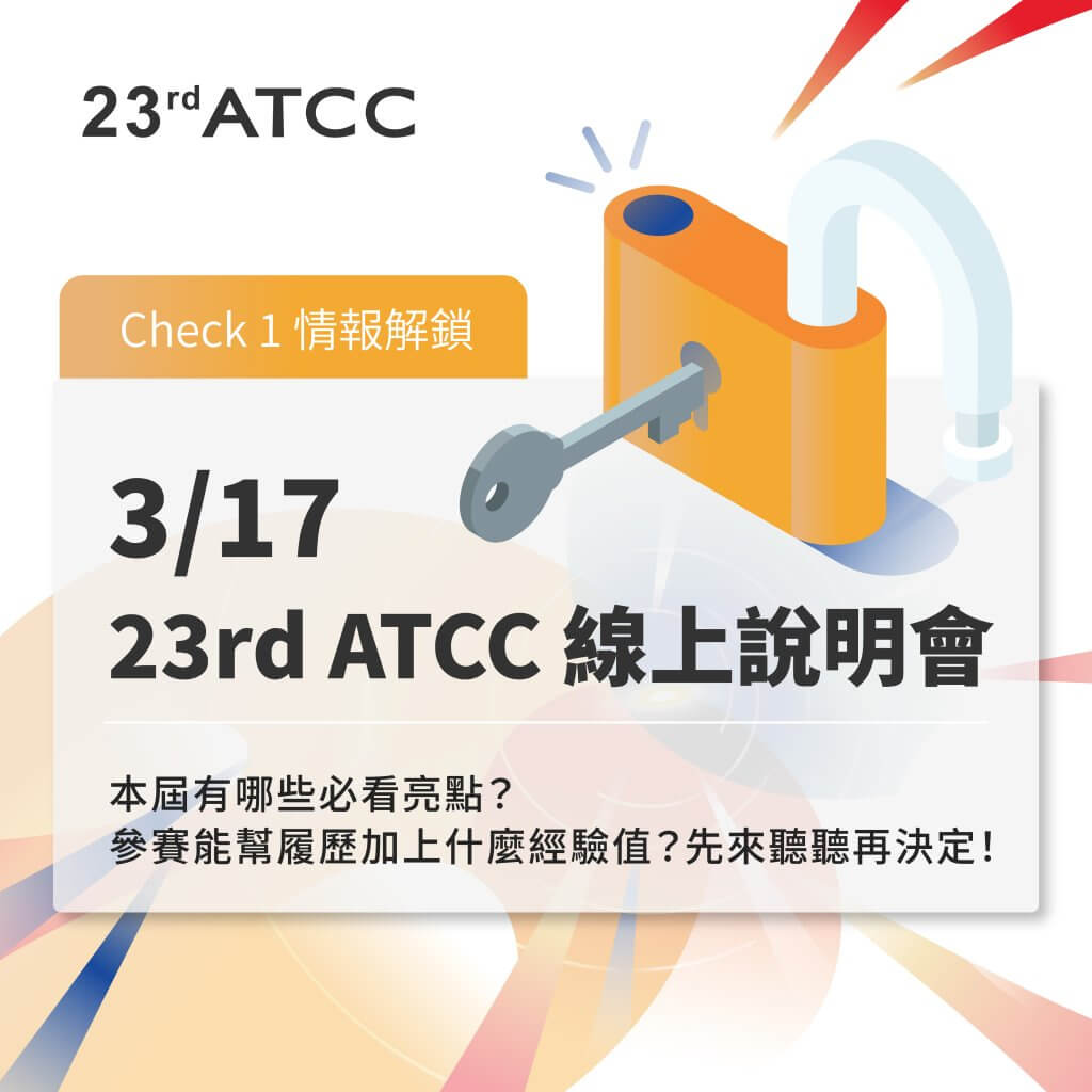 22nd ATCC 將於 3/15 五堂實戰工作坊以及 3/16 開幕論壇暨五堂議題 workshop 揭開為期三個月的精彩賽程,直到 6/22 全國決賽暨頒獎典禮畫下圓滿句點。